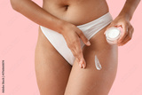 Young woman applying cream to her leg with stretch marks on pink background, closeup