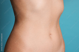Young woman with flat belly on light blue background, closeup
