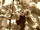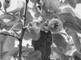 Unripe fruits of the common quince (Cydonia oblonga) on a tree with green leaves.