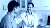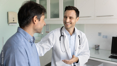Happy doctor hold hand on patient shoulder congratulate on recovery