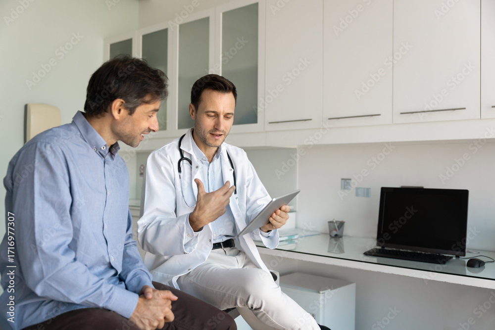 Doctor with demonstrate information on tablet screen to male patient