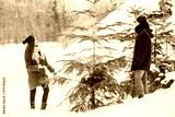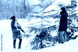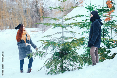 Smiling couple walking in snowy woods together
