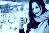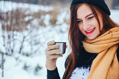 red-haired young woman in scarf drinking tea with thermos in winter forest.