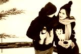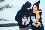 Young couple pours hot tea out of thermos in winter forest