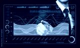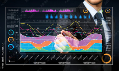 Businessman Interacting with Transparent Data Visualization Display with Graphs and Charts for Digital Analysis and Strategy Planning