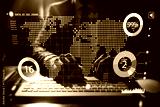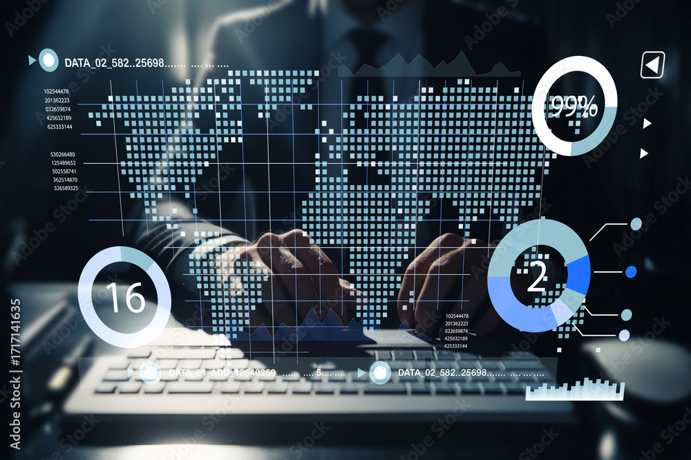 Businessman Analyzing Data on Digital Interface with Graphs and Statistics in Modern Office Environment, Focused on Trends and Insights