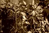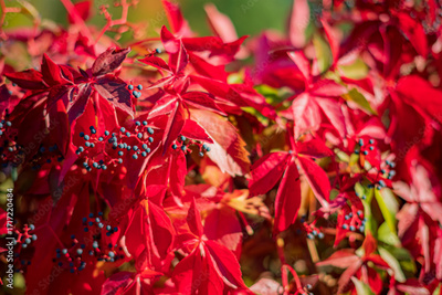 Bright red leaves and glossy dark berries create a beautiful autumn display in nature