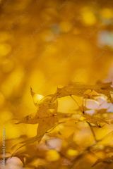 Golden leaves catch warm sunlight, creating a serene autumn atmosphere in a peaceful setting