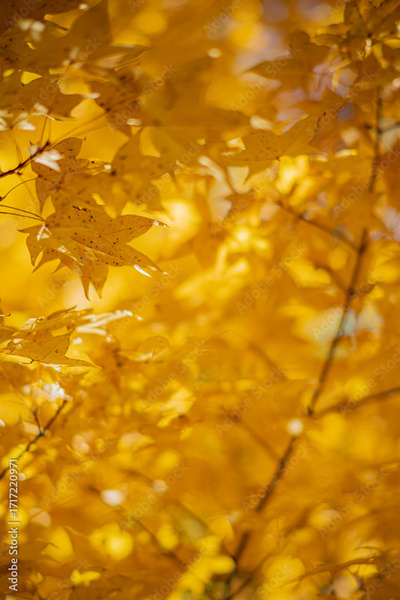 Bright golden leaves gently sway in the breeze, casting warm light on the forest floor below