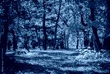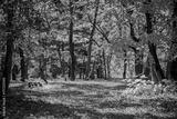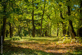 A sunlit forest path showcases vibrant green leaves and fallen autumn foliage