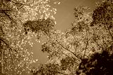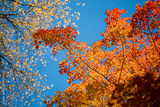 Bright red and yellow leaves adorn branches under a brilliant blue sky, signaling autumn's arrival