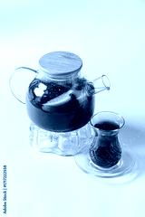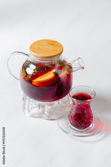 A glass teapot filled with herbal tea and fruits sits beside a small glass cup, enjoying sunlight