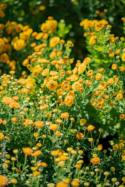 A beautiful scene unfolds as bright yellow flowers flourish in a green garden under sunlight