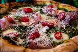 pizza parma with prosciutto ham, cherry tomatoes, arugula with parmesan cheese