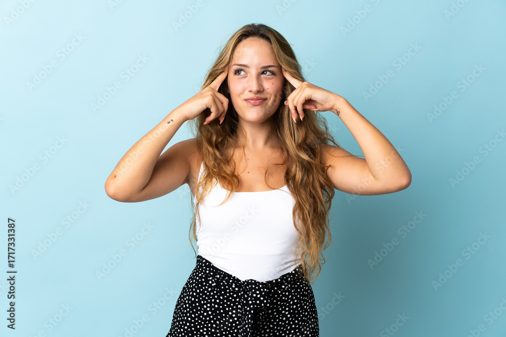 Young blonde woman isolated on blue background having doubts and thinking