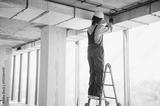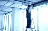 Construction worker installing ventilation system in building