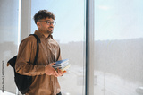 University student holding books and looking out the window