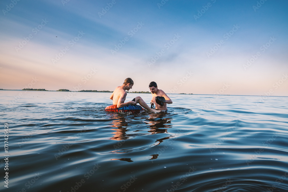 Two young men enjoy a refreshing swim in a tranquil lake at sunset, one floating in an inflatable ring while the other prepares for underwater exploration. Perfect for summer adventures and friendship