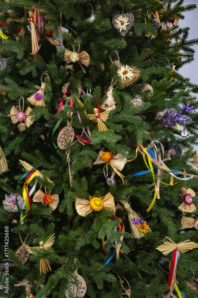 Close-up of a festive Christmas tree adorned with beautiful traditional Ukrainian handmade straw ornaments, dried flowers, and colorful ribbons. A unique folk holiday decoration.