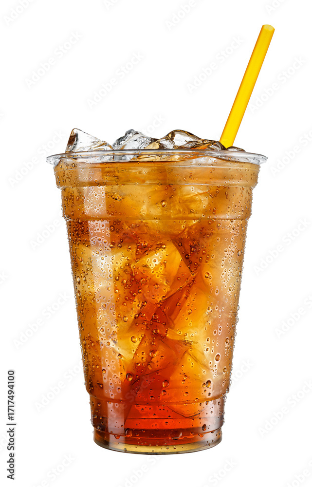 Iced tea in fogged disposable plastic cup with straw isolated on white background