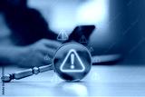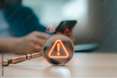 Magnifying glass focusing on warning alert icon with exclamation mark while businessman using smartphone Concept of cyber security data risk system error online fraud technology danger and caution