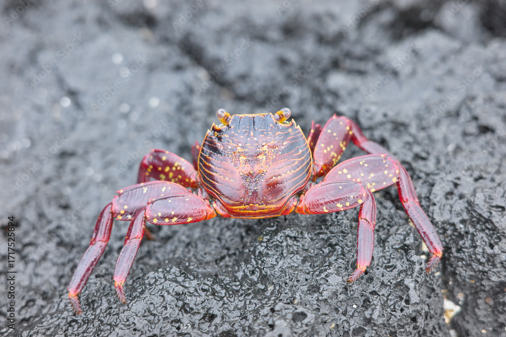 Close up photo of a Sally Lightfoot crab on a volcanic rock, selective focus, Galapagos Islands, Ecuador.