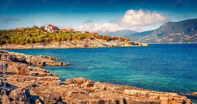 Exciting summer view of Emblisi beach. Warm afternoon scene of Kefalonia island, Greece, Europe. Marvelous morniung seascape of Ionian Sea. Vacation concept background.