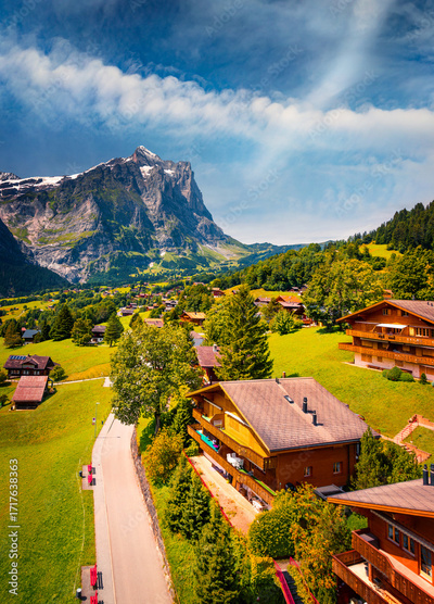 Colorful morning view of Grindelwald village valley from cableway, Switzerland, Europe.