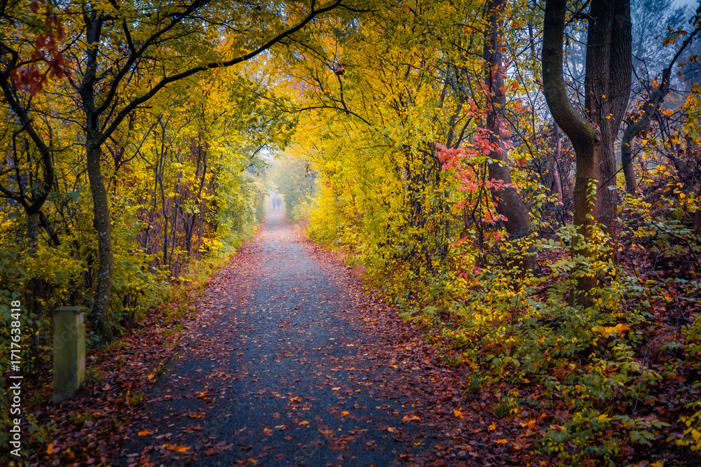 Tourists on the treck in autumn forest. Exciting morning scene of Austrian Alps. Spectacular autumn view of foliage woodland. Beauty of nature concept background.