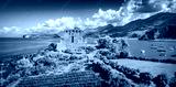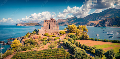 Astonishing summer view from flying drone of historical place - Crawford Tower. Breathtaking morning scene of Italian countryside. Stunning seascape of Mediterranean seascape, Italy, Europe.