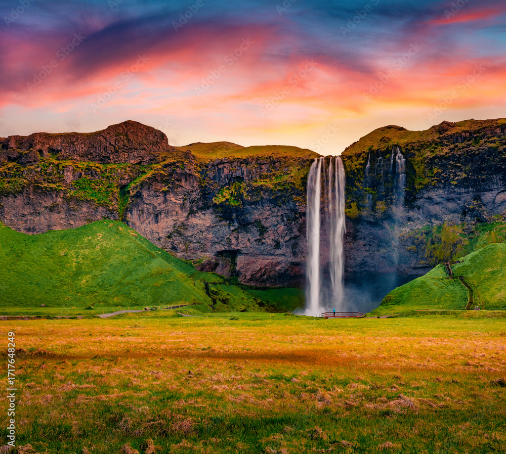 Fantastic morning view of Seljalandfoss Waterfall. Amazing summer sunrise in Iceland, Europe. Beauty of nature concept background.