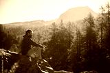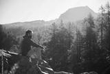 Young adult active man sitting on top rock looking at panorama in sunny spring summer morning on mountain outdoor.