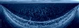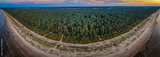 A stunning aerial view of a serene forest sandwiched between two vast bodies of water, bathed in the soft hues of sunset
