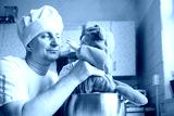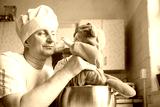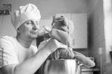 A father and his baby son, wearing carnival costumes, are in the kitchen. The father, wearing a chef's hat, sits next to his child, dressed as a red crab or lobster, who is sitting in a saucepan.