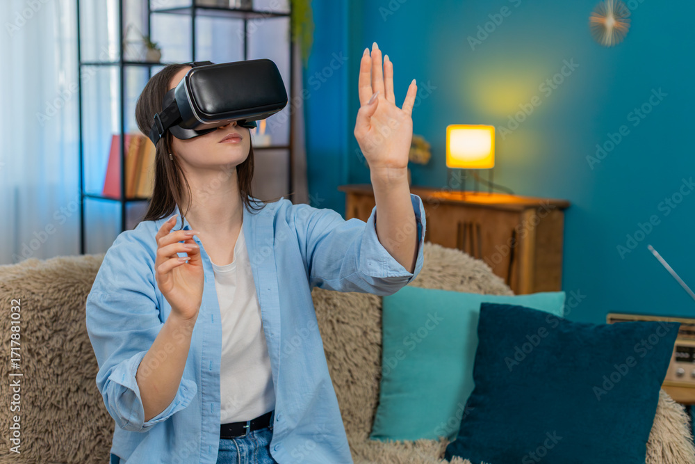 Young woman at home sitting on sofa wearing VR headset, amazedly turning head and actively gesturing. Caucasian girl excitedly explores virtual reality, experiencing emotions of surprise and joy