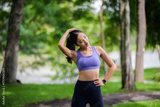 Young Asian woman stretching neck in park, preparing for outdoor workout, promoting fitness and healthy lifestyle