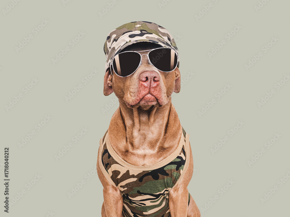 Cute dog, sunglasses and military shirt. Closeup, indoors. Studio shot. Congratulations for family, loved ones, relatives, friends and colleagues. Pet care concept