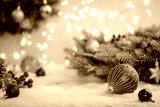 Christmas Holiday background with snow, fir tree and decorations with christmas light behind. Christmas red balls on a winter festive background.