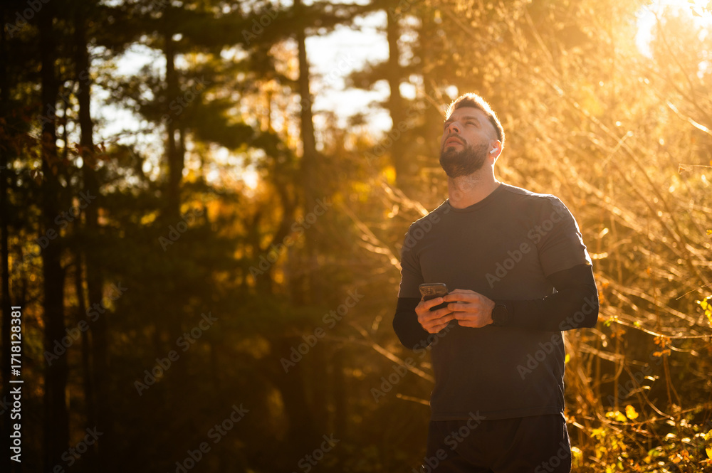 Sportsman holding smartphone and enjoying sunset in forest during training