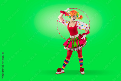 Funny female clown looking through hula hoop, woman entertainer dressed as a colorful Joker in a suit and wig, with clown whiteface makeup. She is a professional actor at events
