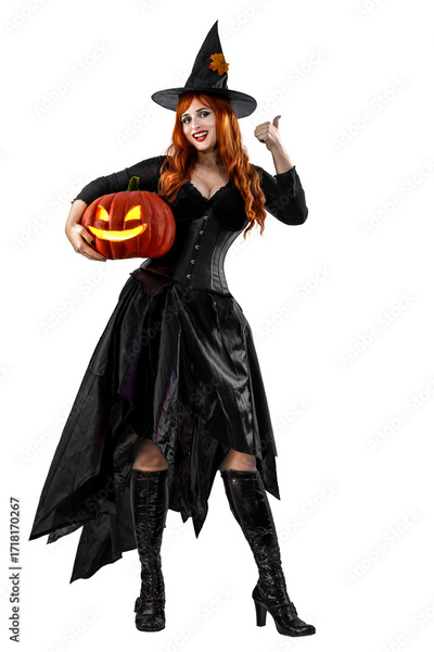 Witch on Halloween. Female wizard fairy character for All Saints' Day. Fantasy gothic red-haired Vampire girl in black dress. Enchantress dressed in carnival costume