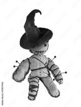 Homemade voodoo doll in a conical witch hat, Halloween decor on isolated background.