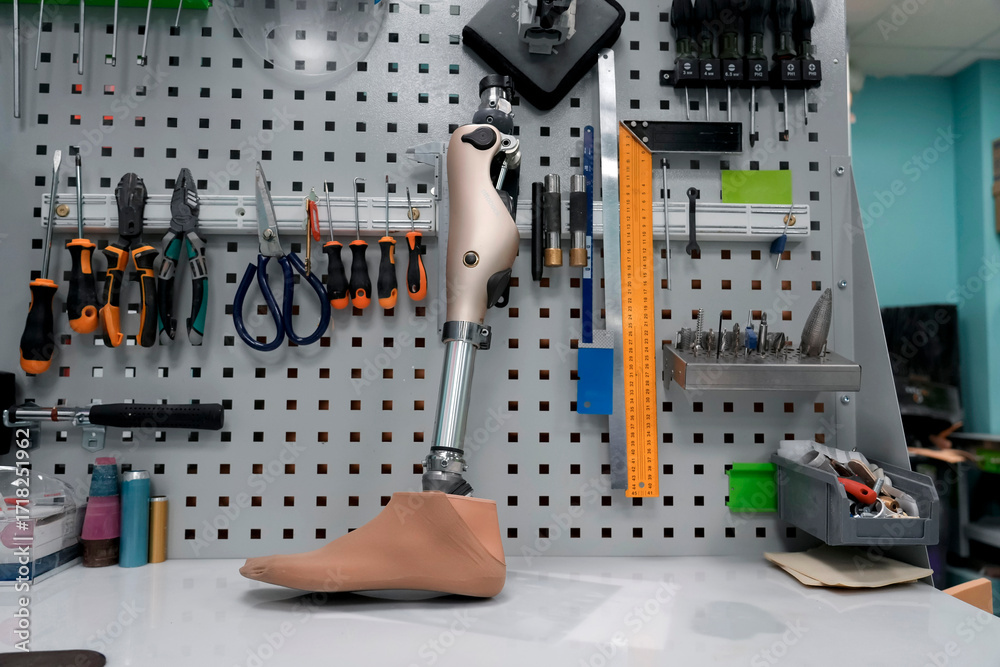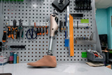 A prosthetic leg stands on a white workbench. Various tools, including screwdrivers, pliers, and scissors, hang on a pegboard behind the prosthesis in the workshop