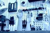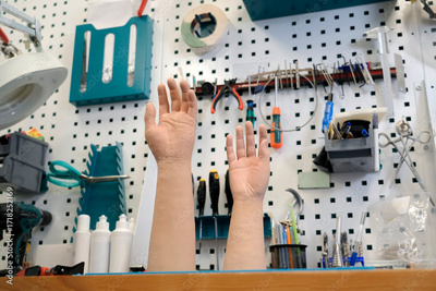 Two prosthetic arms and hands are shown raised on a workbench. Tools and equipment hang on a pegboard behind them in the workshop