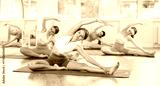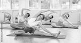 Young girl performing Parighasana side stretch asana, or Gate Pose, kneeling on leg on mat and extending arm overhead