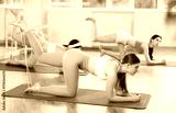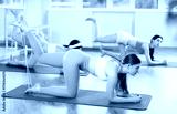 Slender young girls practicing back leg lift with resistance band standing on knees in pilates studio