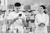 Happy young male customer scan QR code on label and selecting cream or skin care product in modern drugstore. Female pharmacist helping with choosing and offering variations of medicines