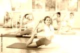 Young female teacher train during hatha yoga class, perform exercises stretches. Girl participants group working out practice pigeon pose, kapotasana