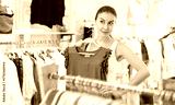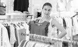 Girl customer chooses blouse in store, and buyer carefully examines product. Megamall, branded clothing store, franchise. Woman of fashion near showcase chooses summer clothes, examines goods.