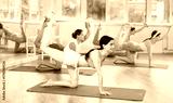 Slender young girls practicing back leg lift with resistance band standing on knees in pilates studio